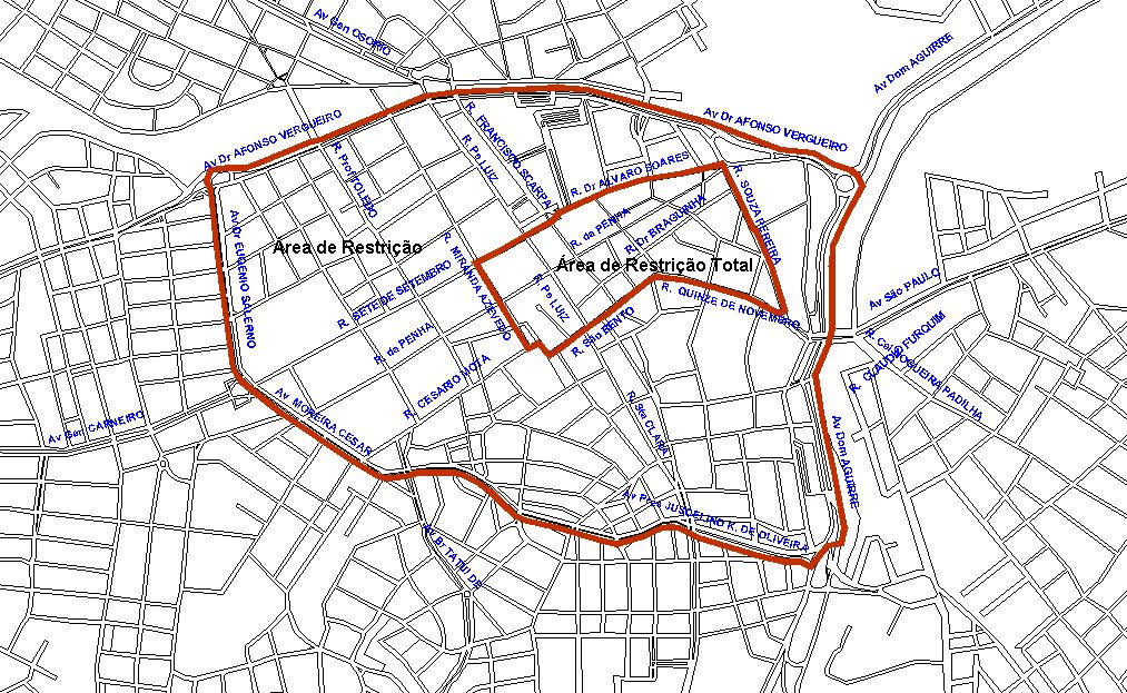 II – Área de Máxima Restrição – todas as vias urbanas compreendidas entre as Ruas: Cesário Mota (trecho entre a Rua Miranda Azevedo e Rua São Bento – Praça. Carlos de Campos), São Bento, XV de Novembro, Souza Pereira, Dr. Álvaro Soares, Sete de Setembro (trecho entre a Rua Coronel Benedito Pires e Rua Miranda Azevedo) e Miranda Azevedo (trecho entre a Rua Cesário Mota e a Rua Sete de Setembro), inclusive estas;