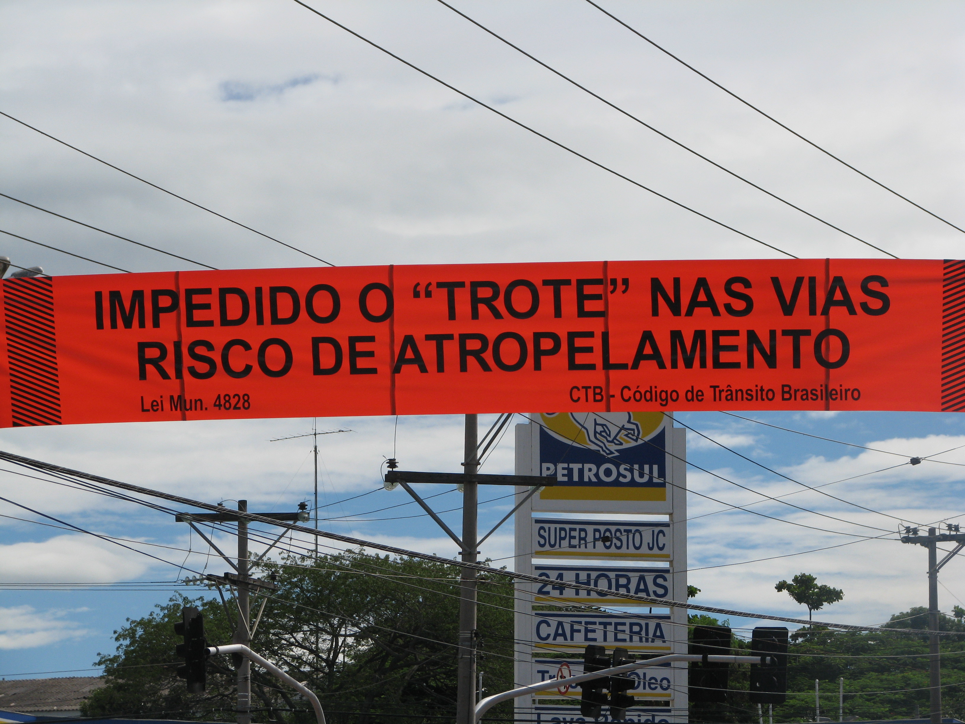 As faixas, que já foram usadas nos últimos anos têm o aviso - Impedido o trote nas vias - Risco de atropelamento -, além do número da lei municipal que proíbe o ato e de uma menção ao CTB. Os alertas foram colocados nas avenidas Washington Luiz, Juscelino K. de Oliveira, Comendador Pereira Inácio e Barão de Tatuí.