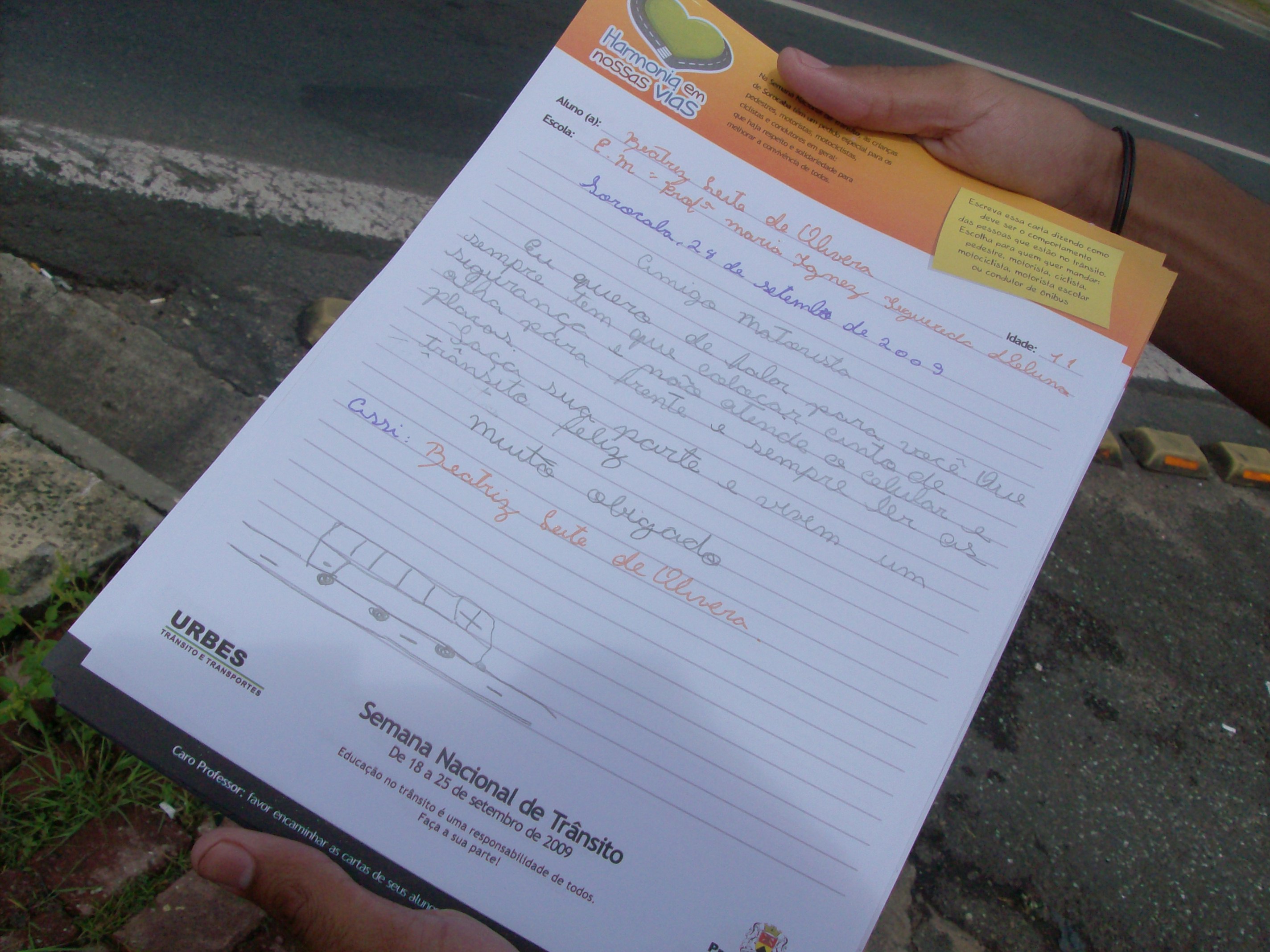 As cartas foram selecionadas por técnicos da Urbes a fim de dar dicas aos motoristas, condutores escolares, motociclistas, ciclistas e pedestres. E foi o que aconteceu nesta terça-feira. A intenção: envolver a sociedade no sentido de despertar para a necessidade de se respeitar as leis para tornar o trânsito mais seguro.