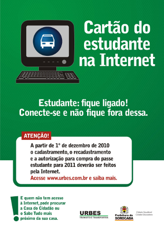 A partir desta quarta-feira, dia 1º de dezembro, a Urbes – Trânsito e Transportes deu início ao cadastramento e recadastramento para a compra do passe estudante de 2011 pela Internet. A inovação do poder público que teve início no ano passado, modernizou o sistema que era um tanto burocrático. Antigamente os alunos só conseguim fazer o pedido do passe através da secretaria da sua escola. Atualmente, com o cadastro pela rede mundial de computadores, no período de 01/12/2009 até 30/11/2010, já foram realizados 43066 solicitações entre atualizações cadastrais e novos cartões.