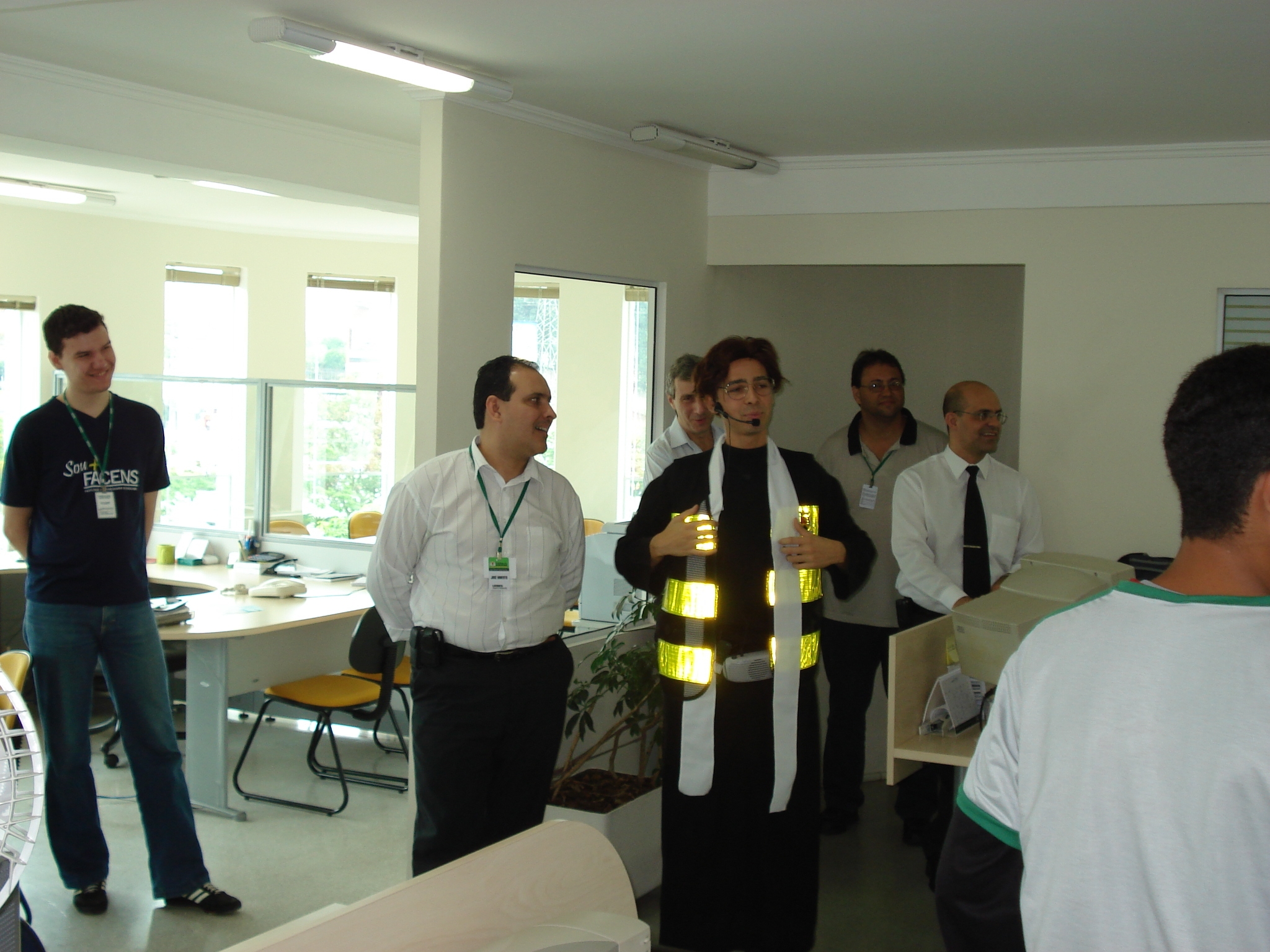 O café da manhã não foi a única novidade do dia. Os funcionários também assistiram a uma apresentação de teatro. De forma divertida, dois atores explicaram que é preciso ter boa postura no ambiente de trabalho, seja ao atender ao telefone ou ao digitar no computador.