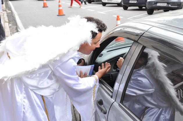 Para esta atividade arte-educadores estarão vestidos de anjo e, além da abordagem lúdica e engraçada, distribuirão folhetos com o tema travessia segura.
