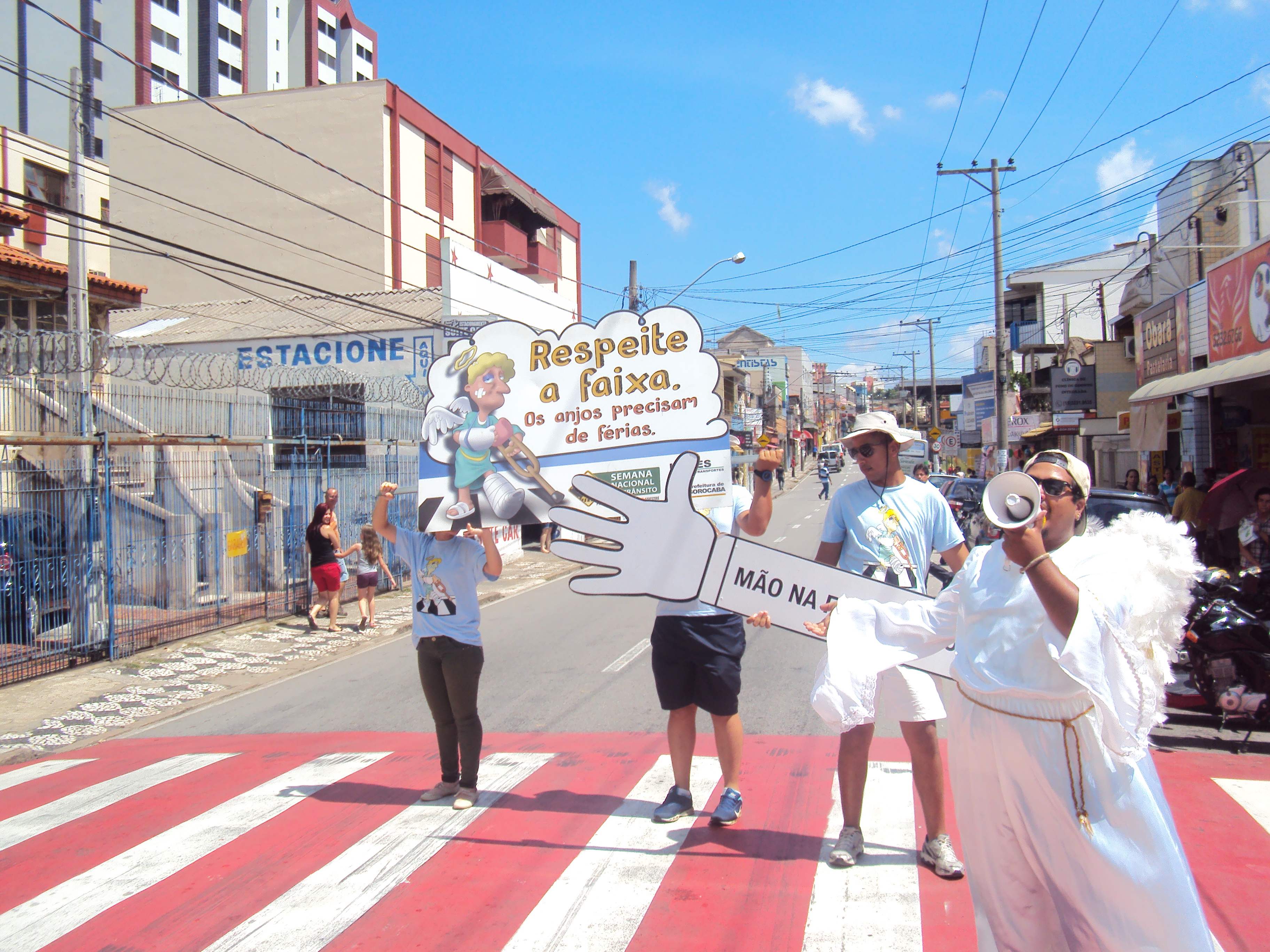 Os arte-educadores da Urbes estão em duas faixas de pedestres da região central vestido de anjos. As ações incentivam as pessoas a pedirem a passagem de forma consciente e com segurança e, ainda, motiva o motorista a contribuir com um trânsito mais cordial, respeitando o mais fraco elemento da mobilidade urbana: o pedestre.