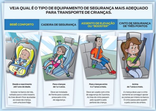 Atualmente existem quatro dispositivos de segurança para preservar a integridade física das crianças durante o transporte em veículos: o bebê conforto (para crianças de até um ano de idade), a cadeirinha (para crianças com idade superior a um ano e inferior ou igual a quatro anos), o assento de elevação (para crianças com idade superior a quatro anos e inferior ou igual a sete anos e meio atrelado ao cinto de segurança de três pontos) e o cinto de segurança de três pontos (para crianças a partir de sete anos e meio no banco traseiro).