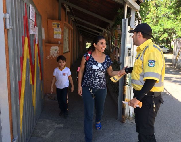 Durante a atividade, na entrada e saída dos alunos, a equipe de Educação para o Trânsito distribuiu um material educativo e conversou com os pais e responsáveis.