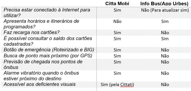O Info Bus e o Citta Mobi são os principais aplicativos utilizados pelos usuários no transporte coletivo. Outros aplicativos são o Info Táxi, com informações de pontos, veículos, motoristas e tarifas e o Urbes Escolar, que entres as informações disponíveis, apresenta a relação dos veículos cadastrados, motoristas e escolas atendidas.