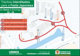 A Urbes – Trânsito e Transportes informa que a partir da sexta-feira (26) são interditados trechos de três ruas no jardim Panorama, na região do Campolim. A intervenção é necessária para a promoção da Festa da Colônia Japonesa, que será aberta ao público gratuitamente e promovida no final de semana, na praça Kasato Maru