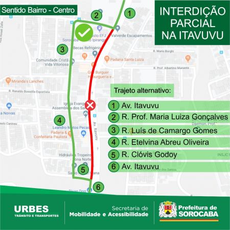 A Urbes orienta os motoristas a utilizarem o caminho alternativo formado de ruas paralelas à avenida Itavuvu e indicado no mapa anexo a esse texto. No sentido oposto da avenida Itavuvu, do centro para o bairro, o trânsito flui normalmente, sem previsão para interdições.