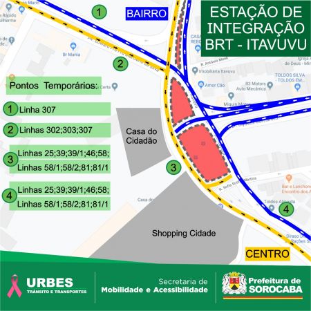 Por conta das obras de implantação do BRT, que avançam pelo corredor Norte - uma das artérias do sistema rápido de transporte coletivo, a partir do dia 14 de outubro (segunda-feira) a Área de Transferência Itavuvu, localizada em frente ao Shopping Cidade, será parcialmente desativada. O fechamento da AT Itavuvu acontecerá em etapas, com o objetivo de amenizar os efeitos temporários causados pelas obras necessárias à implantação das melhorias que estão sendo feitas no local.