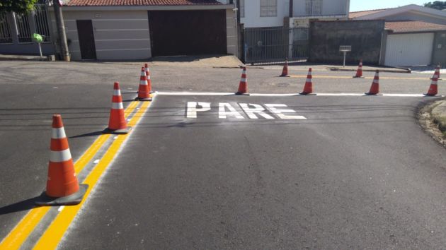 Ao todo foram feitos aproximadamente 200 metros quadrados de sinalização de solo que incluem faixas de retenção, legenda “pare”, linhas duplas amarelas, entre outros.