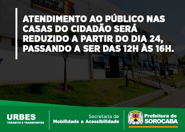 Já o atendimento ao público nas Casas do Cidadão será reduzido a partir de terça-feira (24). Com isso, o horário de atendimento nas unidades, inclusive dos serviços prestados pela Urbes – Trânsito e Transportes, passa a ser das 12h às 16h. Esta medida foi tomada visando reduzir aglomerações de pessoas e assim evitar a possível propagação do vírus.