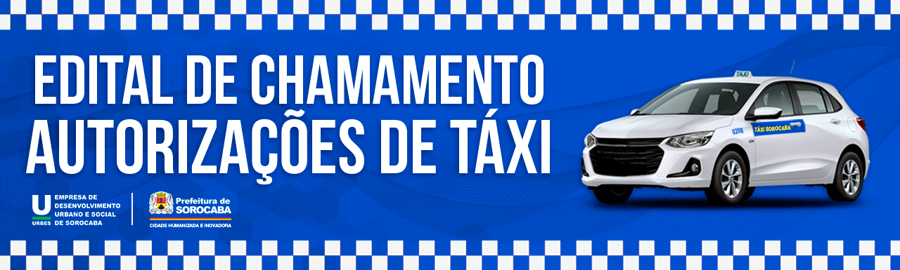 A Prefeitura de Sorocaba, por meio da Urbes – Trânsito e Transportes, anuncia hoje, em 01/09/2023, a publicação do Edital de Chamamento destinado à concessão de 39 (trinta e nove) autorizações de táxi na cidade de Sorocaba. Os interessados têm o período compreendido entre 05/09/2023 e 08/10/2023 para realizar suas inscrições, as quais devem ser feitas através do site oficial: www.urbes.com.br. Para acessar o Edital de Chamamento Autorizações de Táxi, basta clicar no banner correspondente, disponível na página principal do referido site.